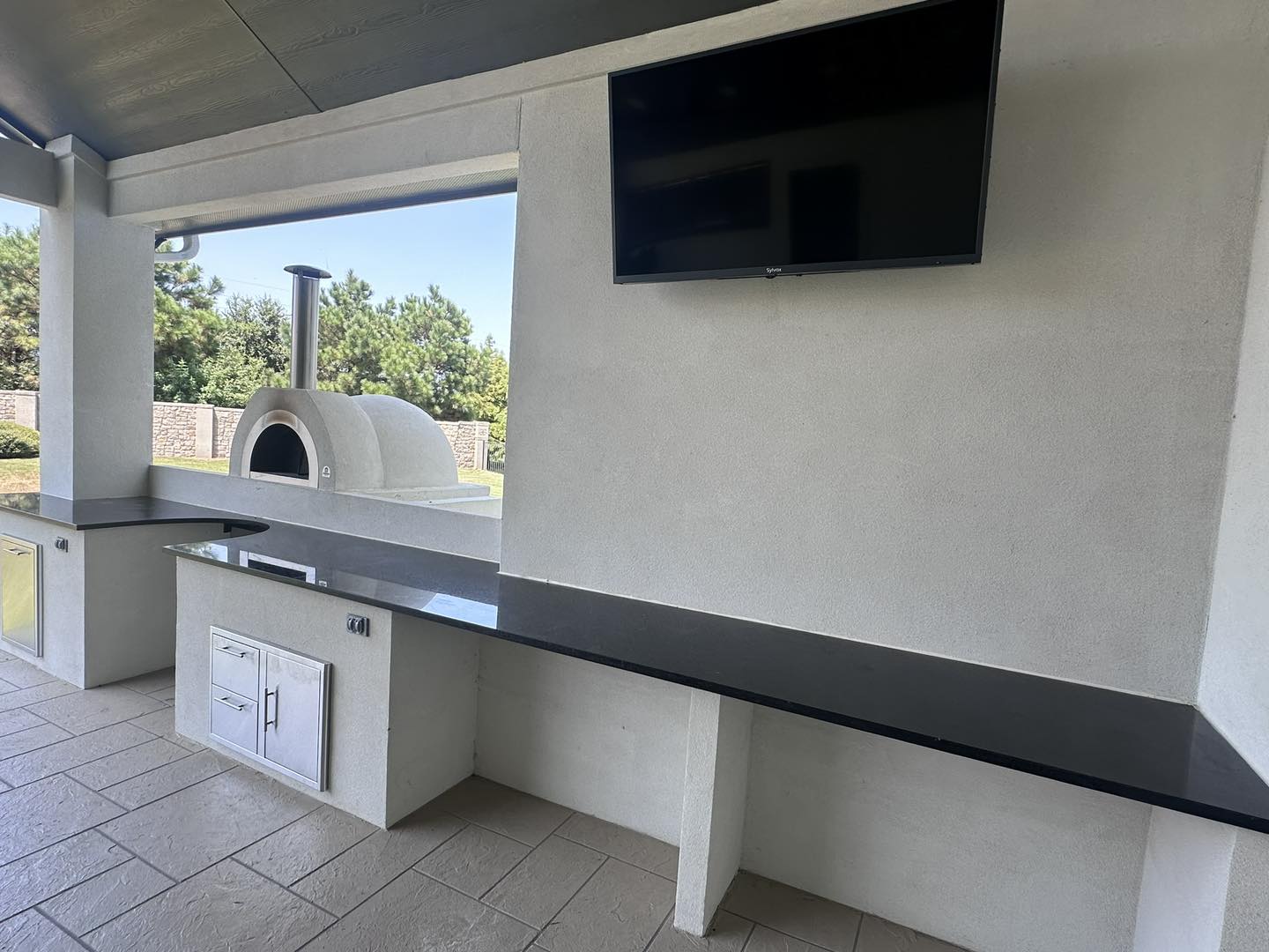 The highlight of this project is the 22’ long pizza oven cooking station, a chef’s dream designed for unforgettable gatherings with family and friends. The space is enhanced with a hand-carved concrete overlay, giving the patio a custom, high-end finish that adds durability and timeless charm.