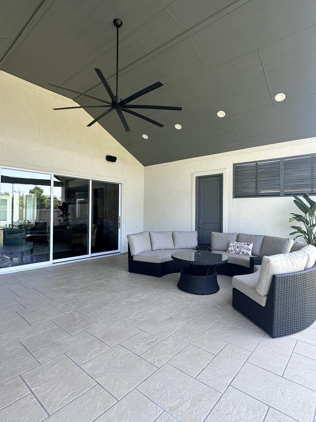 To complete the aesthetic and functionality, we installed a Hardie ceiling with new electrical work and a premium Minka Aire fan, ensuring comfort and style year-round. A stucco Privacy/TV Wall with slatted shutters provides shade, privacy, and the perfect spot for outdoor entertainment.